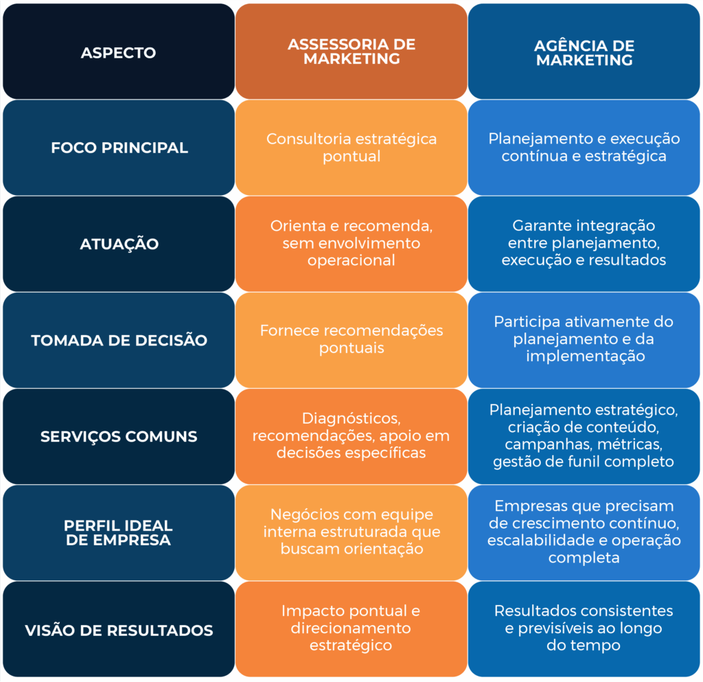 A assessoria em marketing digital tem um caráter consultivo e pontual. Seu foco principal é orientar empresas sobre estratégias, dar recomendações e apoiar em decisões importantes, sem necessariamente se envolver na execução contínua das ações.